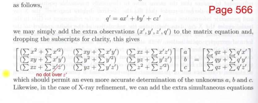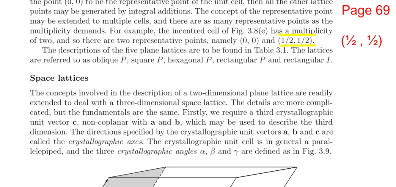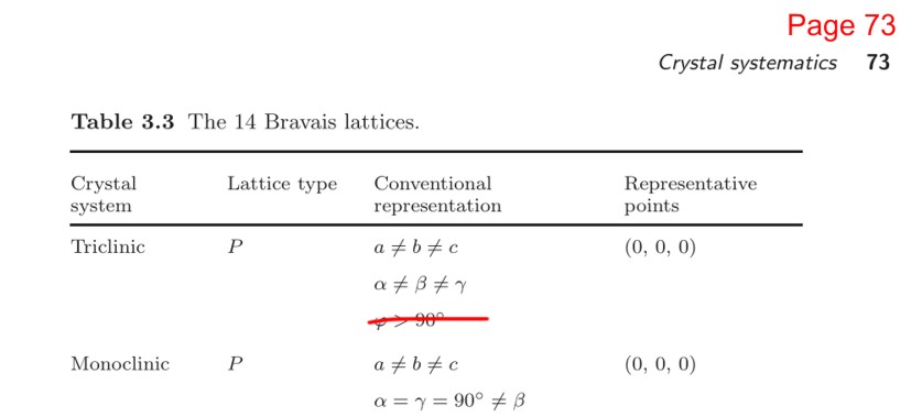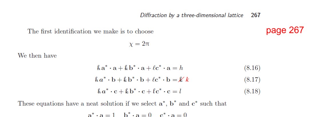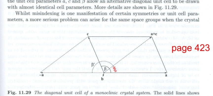 Chapter 3. It should have been stated that with triclinic unit cells, the convention is for all angles to be acute, though the convention allows for two possibilities: all acute or all obtuse. Thanks to Dr Ian Tickle (Global Phasing) for making this point.