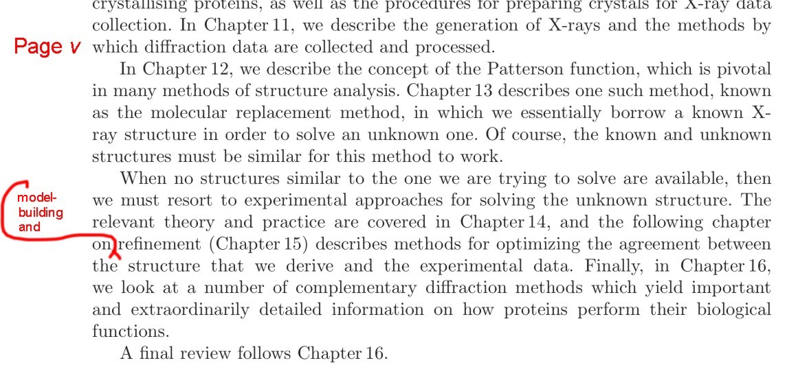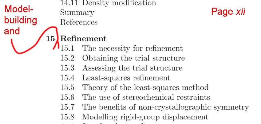 Part III provides a description of the modern methods for protein crystallography. Much attention is spent on Patterson methods and the phase problem, with the same attention to detail as the first two parts. There is a good description of least squares refinement and the adaptions for constraints and restraints. Maximum likelihood and simulated annealing are also described. However very little about statistics is discussed. This is a very important topic in crystallography and deserves more space. I found Part III lacking in the practical aspects of modern protein crystallography although it is very well referenced.