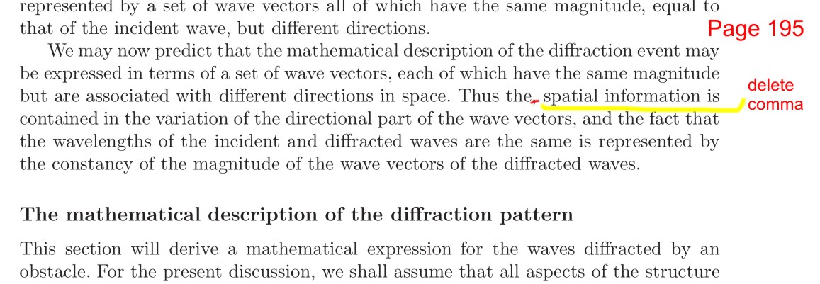 Part I and Part II provide an integrated approach to teaching diffraction theory. The author takes the reader through crystal basics and the wave theory of electromagnetic radiation along with the mathematical tools to understand them. In Part II the authors painstakingly develop diffraction theory by analyzing one dimensional lattices then three dimensional lattices. Next the authors explore the concept of lattices with motifs and develop all the details from first principles. The latter includes the derivation of the Laue equations and Bragg's law. I found the step wise description of the Fourier transform and the effect of applying it to various functions and objects something that would help students immensely in understanding the relationship between direct space and reciprocal space.