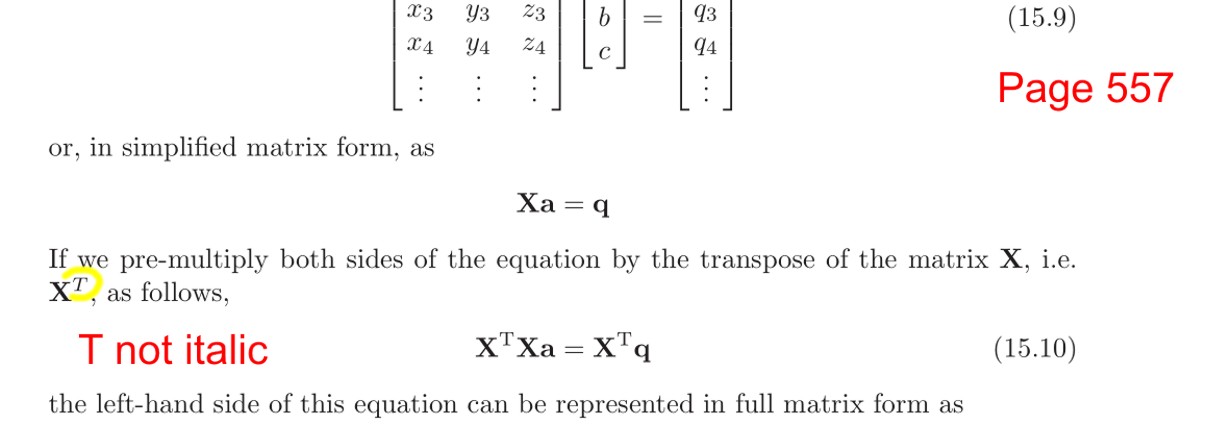 p. 557, 5th equation: The 'T' superscript to 'X' should be plain text, i.e. not italic (as in the equations above).