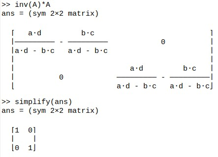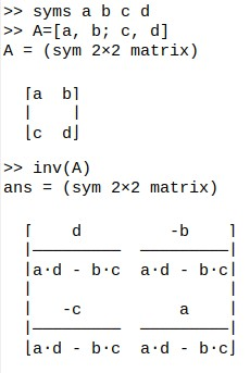Matrix operations can be done, noting that we need to start each new row of a matrix with a semicolon. The following shows a classic matrix inversion.