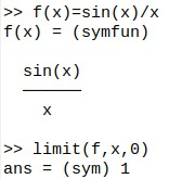 Like de l'Hôpital, we can do limits, too. The following evaluates a function as the variable (x) tends to zero.