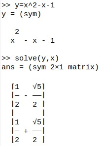 which gives the two solutions in double precision: -0.6180 and 1.6180, the latter being the Golden Ratio .